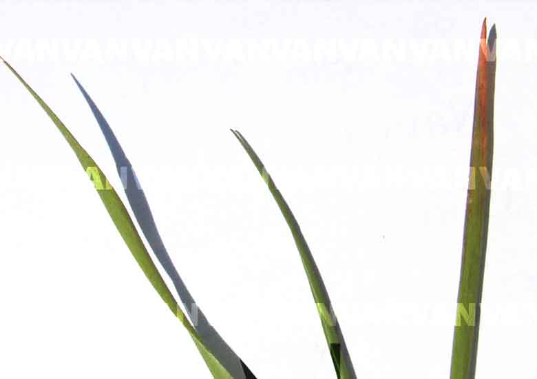 Dark purple discolouration on the leaf tips, advancing down the leaf in a broad front.