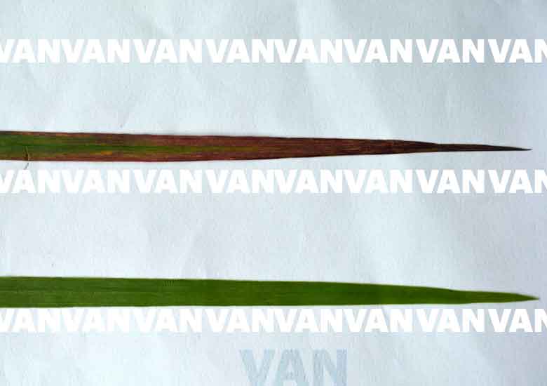 Recommended blanket NPK was added to one plant (bottom leaf) where as only NK was added to the other (top), which expressed the P deficiency symptom of accumulation of anthocyanin pigment. Soil P = 5.9 mg/kg of loamy-sand soil.